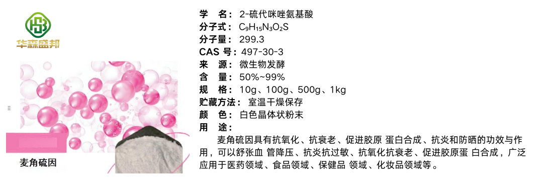 Color: White crystalline powderUsage: Ergothioneine has the effects and functionsof anti-oxidation,anti-aging, promoting collagen synthesis, anti-inflammation andsun protection. lt can dilate blood vessels and lower blood pressure, anti-inflammationand anti-allergy, anti-oxidation and anti-aging, and promote collagen synthesis. ltis widely used in the fields of medicine, food, health products, cosmetics, etc.